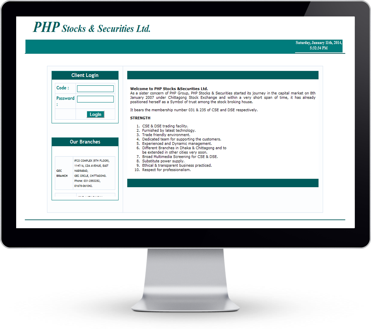 I worked at this project in w3xplorers Bangladesh. By this application people can see their real time portfolio and can trade online both in Dhaka and Chittagong Stock Exchange.